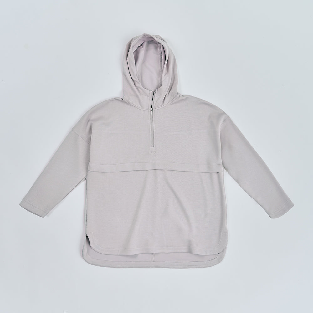 Stay comfy, cosy, and effortlessly stylish with our Half Zip Sweatshirt — inspired by the fit and feel of our bestselling Half Zip Parka. Designed with an adjustable drawstring hood and broad-shoulder sleeves, it offers an airy oversized silhouette complemented by a hi-low hem and curved side seam detailing. The half-length front zipper makes layering easy, while the signature T-shaped back detail and embroidered sleeve logo add a refined finish. The perfect blend of comfort and elevated casual style for every day and every journey.