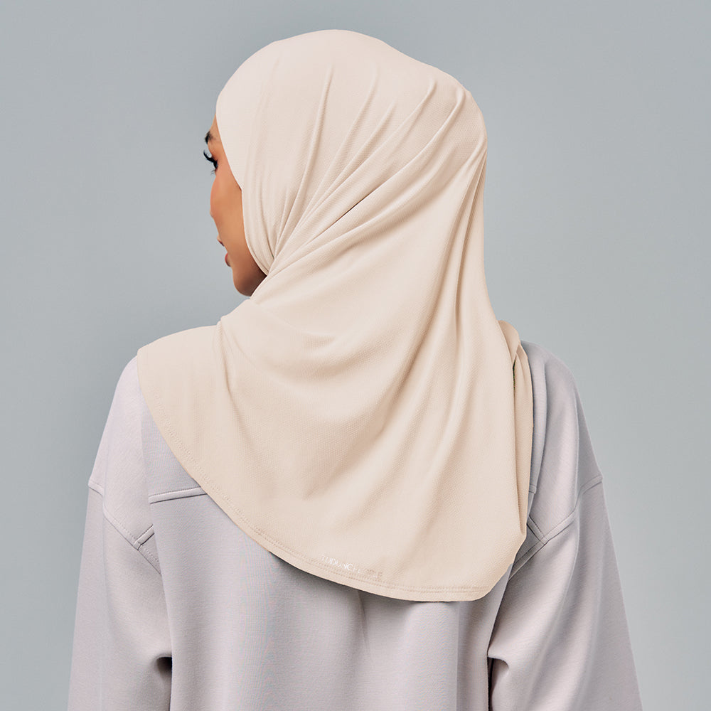 Semi-instant sports hijab in triangle cutting with an attached inner necktie. Freedom to move and easy to style.